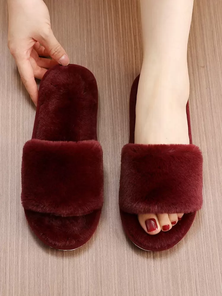 أحذية نوم نسائية باللون الأحمر موضة الخريف/الشتاء، أحذية منزلية فرائية بسيطة، عيد الميلاد