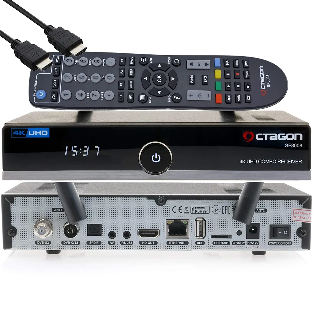 الاكتاجون جهاز استقبال كومبو SF8008 4K UHD HDR 1x DVB-S2X و1x DVB-C/DVB-T2 – قمر صناعي، كابل/اشارة ارضية، صندوق تلفزيون ذكي لينكس E2، خادم وسائط، وظيفة التسجيل، منفذ HDMI ايزي ماوس، واي فاي مزدوج