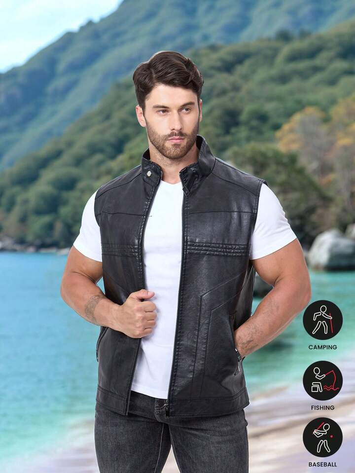 جاكيت جلدية مقاومة للماء للدراجات النارية للرجال، بلا أكمام، أسود اللون، مناسب للربيع والصيف