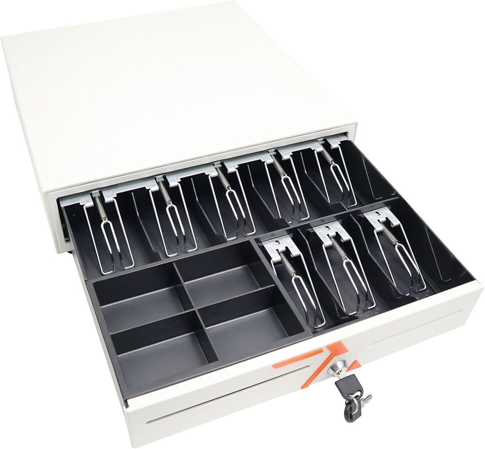 درج نقود نقاط البيع من اتش كوزمي | حجم قياسي | شديد التحمل | فتح تلقائي | واجهة طابعة RJ11 | 8 ملاحظات و4 عملات معدنية | صينية عملات معدنية قابلة للازالة | درج نقود (ابيض)