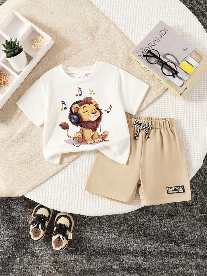 طقم تي شيرت بأكمام قصيرة وشورت مطبوع عليهما صور أسود للأطفال الصغار، ملابس صيفية
