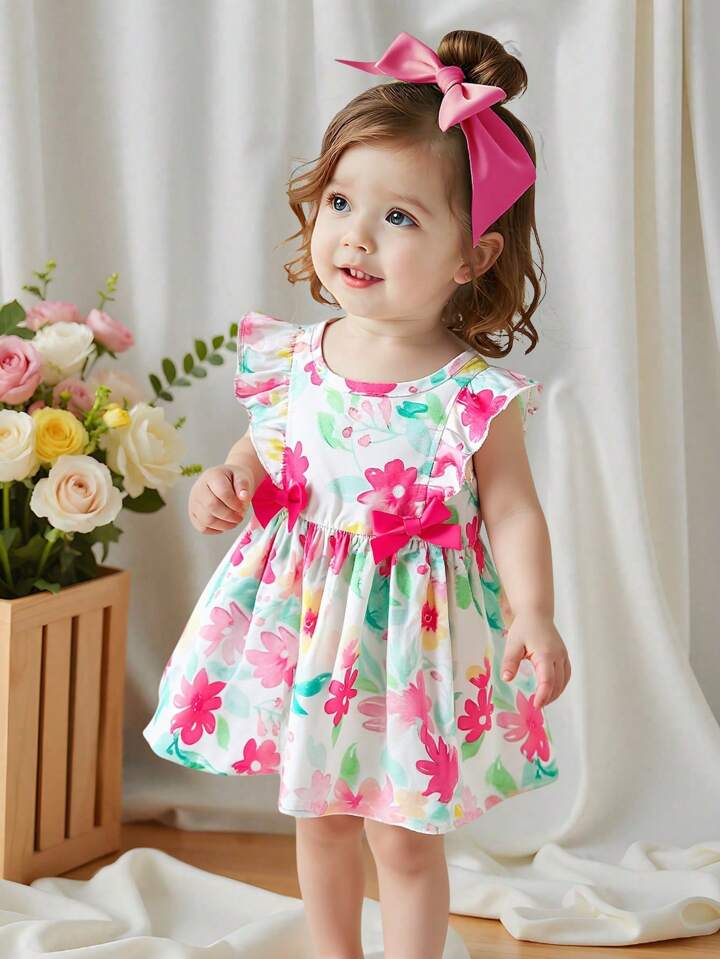 فستان أخضر فاتح لطفلة بطبعة الأرنب الرقيقة والزهور والنباتات بدون أكمام مزين بالكشكش والفيونكة بتصميم A-line مع عصابة رأس، مناسب للربيع/الصيف وخروج عيد الفصح والتصوير الفوتوغرافي أو الارتداء اليومي