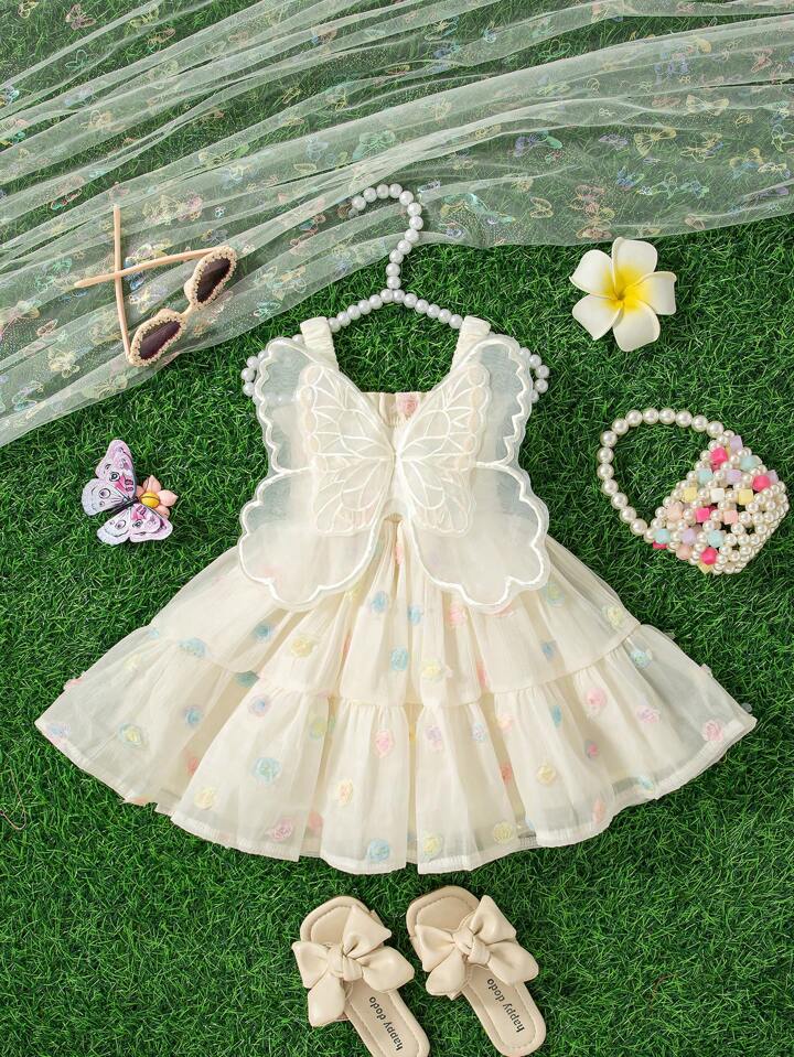 فستان صيفي للبنات بدون أكمام وحمالات، فستان أميرة للحفلات مزين بزهور 3D وأجنحة فراشات كبيرة