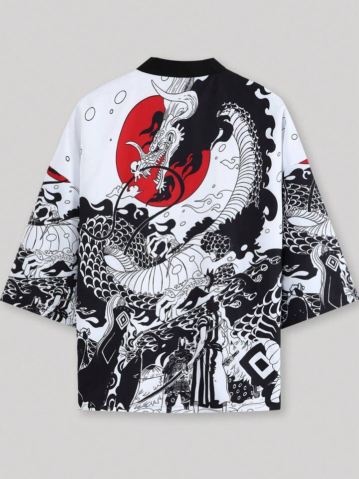 كيمونو ياباني للرجال مطبوع بتنين ذو هلال أحمر على الطراز الأنمي للخريف