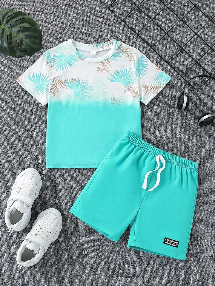 مجموعة ملابس علوية وشورت 2 قطعة بطبعات الخضريات الاستوائية للأطفال الصغار ,أكمام قصيرة وياقة طاقم , مناسب للصيف، الرياضة،اليومي،الخارجي،المدرسة