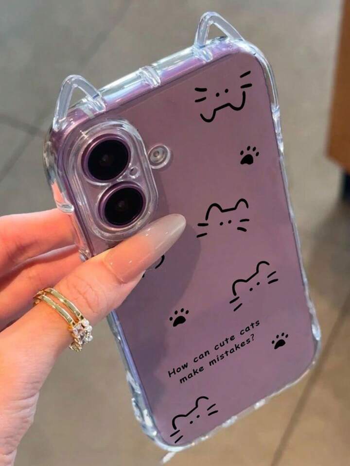 1 جراب هاتف شفاف محمي برقاقة هوائية مع طبعة قطع غيار القط والشعار، تصميم أذن القط الناعم من السيليكون TPU بسمك 1.5مم مع فتحة سلسلة، مناسب لهواتف آيفون 16/16برو/16بلس/16برو ماكس/15برو ماكس/11/12/13/14/15بلس/15برو/14برو/13برو/16 إي