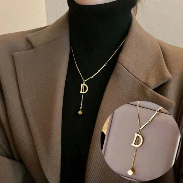 1 قطعة قلادة مع سلسلة حرفية من الفولاذ المعالج بالتيتانيوم باللون الذهبي، قلادة مع شرابة وخرزة مكعبة، سلسلة حرفية تركيب الاسم للنساء والفتيات، هدية قلادة أنيقة ورائعة للسيدات