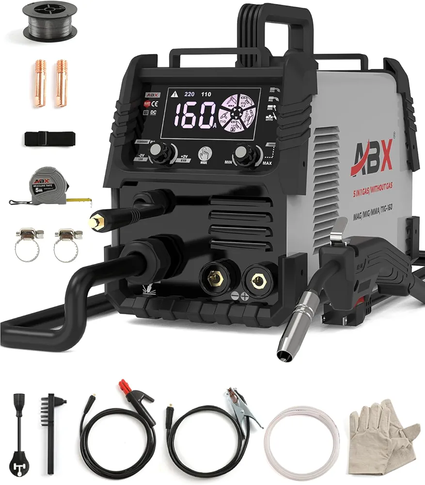 ABX MAG160A Welder, Welding Machine, 5 in 1 MMA Stick/GAS MIG/MAG/Gasless FLUX-CORED/LIFT TIG/Spot, 110V/220V Dual Voltage With Tape Measure, IGBT Inverter, Digital Screen Display
