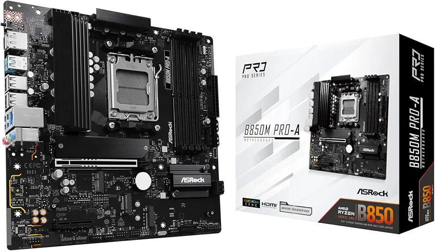 ASRock AMD B850M Pro A Socket AM5 Ryzen 9000/8000/7000 Series DDR5 8000+ (OC) MHz 256GB Micro ATX Motherboard SATA3 6.0 Gb/s PCIe 5.0 B850 M.2 Key E for WiFi 6E BIOS Flashback 2.5G LAN