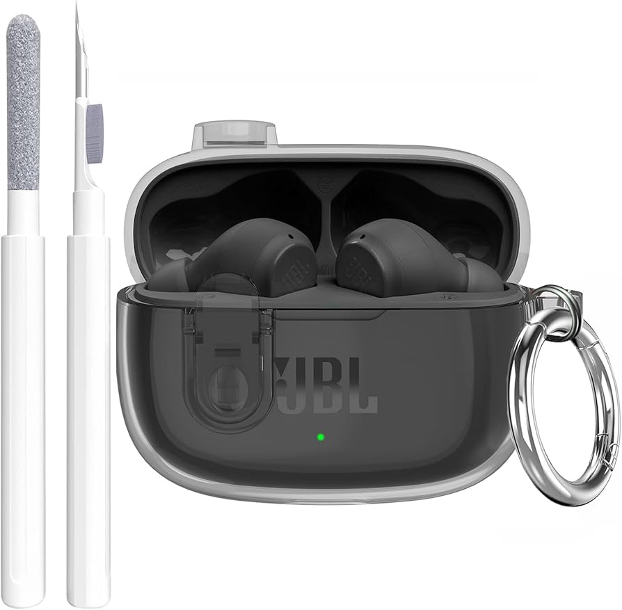 Compatible with JBL Vibe 200TWS/JBL Vibe Beam/Beam 2 Case Cover Clear Lock Clip with Cleaner Kit, Transparent TPU Protective Cover Men Women with Carabiner for JBL Vibe Beam 2 Charging Case – Black