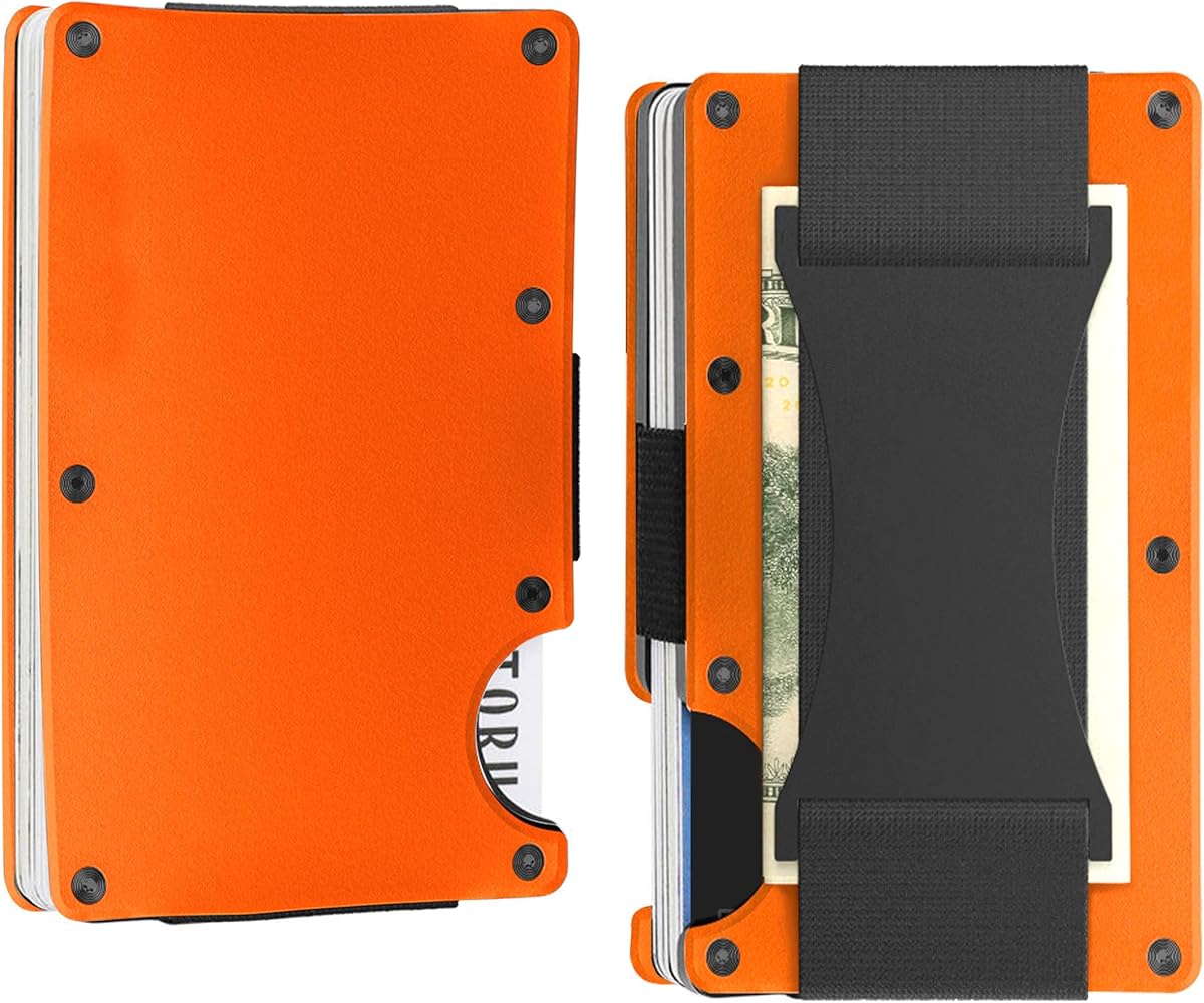 EDGE Men Minimalist Aluminum Wallet with Cash Strap Slim Wallet for Men, Thin as a Rail, Minimalist Aesthetics, Holds up to 12 Cards, RFID Safe, Blocks Chip Readers Orange