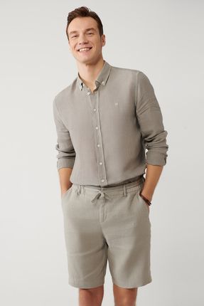 Erkek Gri %100 Keten Düğmeli Yaka Gömlek B002191