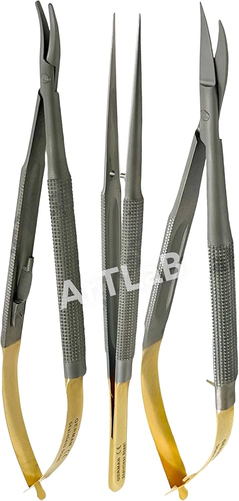 GERMAN STAINLESS TC SET OF 3 Castroviejo Micro Scissors Needle Holder CURVED Plus Forceps Dental EYE GERMAN