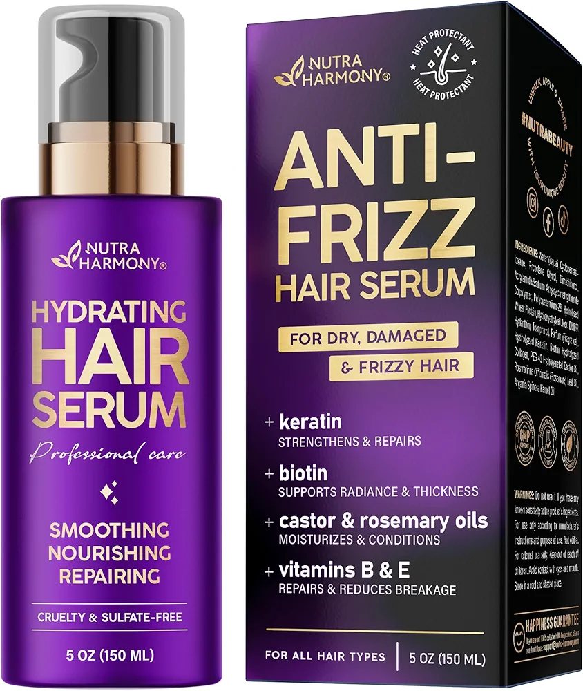 Hydrating Hair Serum for Frizzy and Damaged Hair – Keratin Hair Treatment for Dry Damaged Hair w/ Biotin, Castor Oil, Rosemary Oil, Hair Heat Protectant & Anti Frizz Hair Serum For Frizzy Hair, 5 Oz