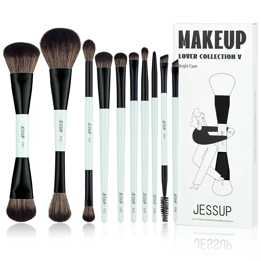 Jessup Makeup Brushes Set 10pcs, Double Sided Foundation Contour Blush Highlight Blending Eyebrow Brush Eyeshadow Eyeliner Concealer Brush, Bright Cyan Cruelty Free Cosmetic Tools T500