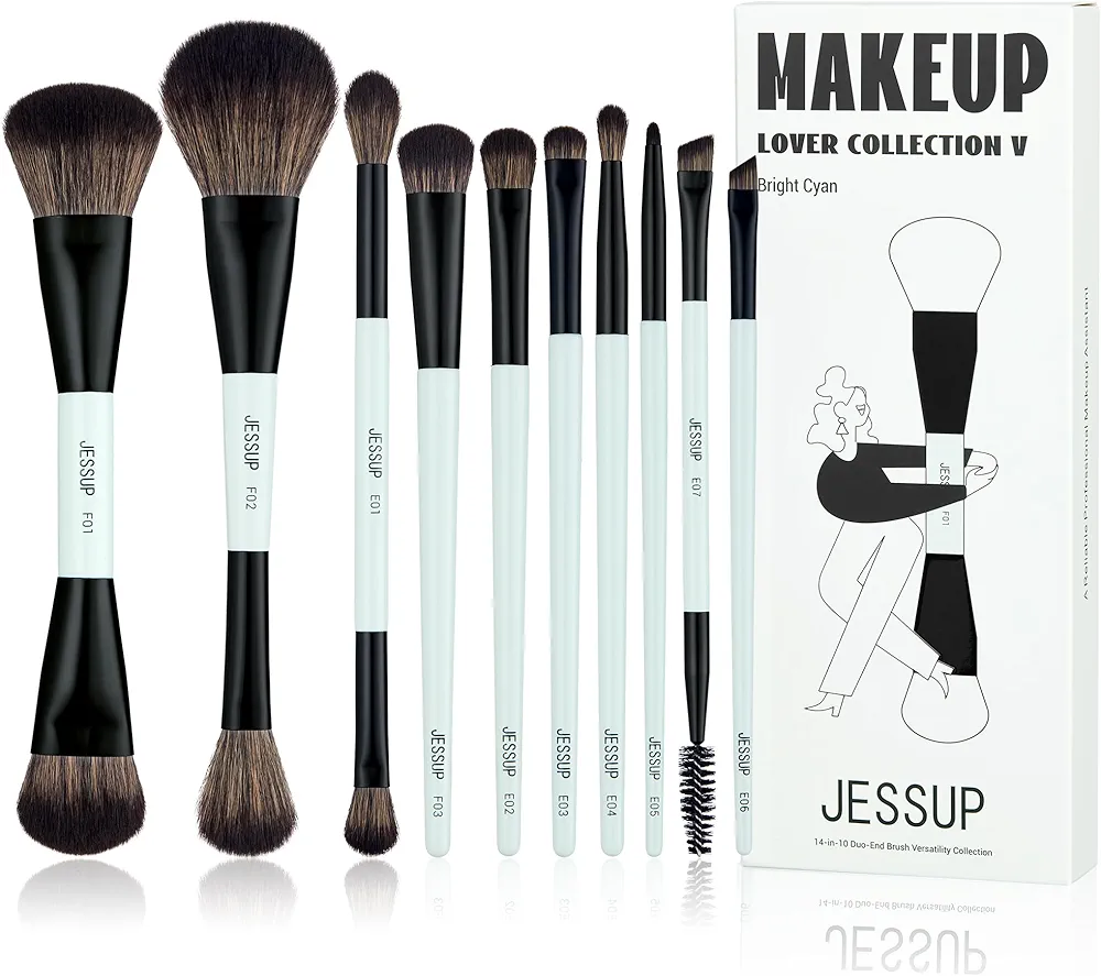 Jessup Makeup Brushes Set 10pcs, Double Sided Foundation Contour Blush Highlight Blending Eyebrow Brush Eyeshadow Eyeliner Concealer Brush, Bright Cyan Cruelty Free Cosmetic Tools T500