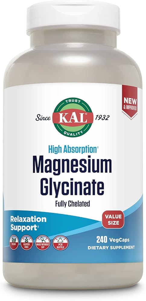 KAL Magnesium Glycinate, New & Improved Fully Chelated High Absorption Formula with BioPerine, Bisglycinate Chelate for Stress, Relaxation, Muscle & Bone Health Support, 60 Servings, 240 VegCaps