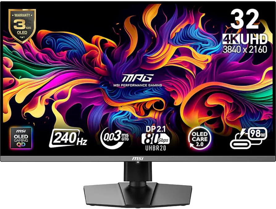 MSI MPG 322URX QD-OLED 32-inch 3840 x 2160 (UHD) Computer Monitor, 240Hz, Adaptive-Synch, HDMI, DP Port, VESA Mountable, Tilt, Speaker, 0.03ms, Black