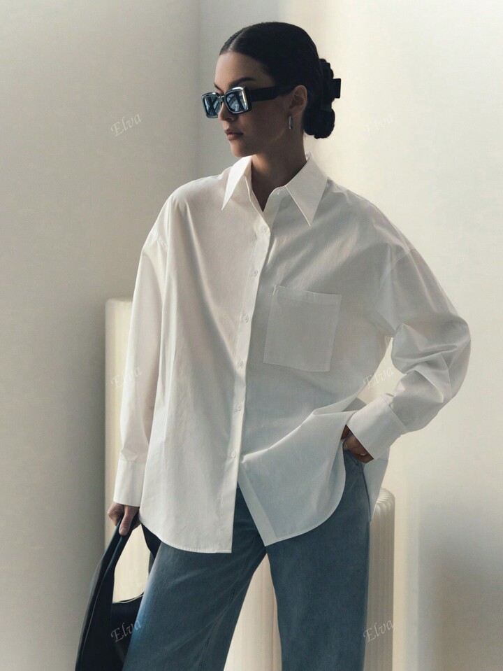 QIANZHIDU قميص نسائي بلون واحد أكمام طويلة، للعمل والمقابلات والمشي والاسترخاء بتصميم بسيط أنيق، مناسب للربيع والصيف والخريف