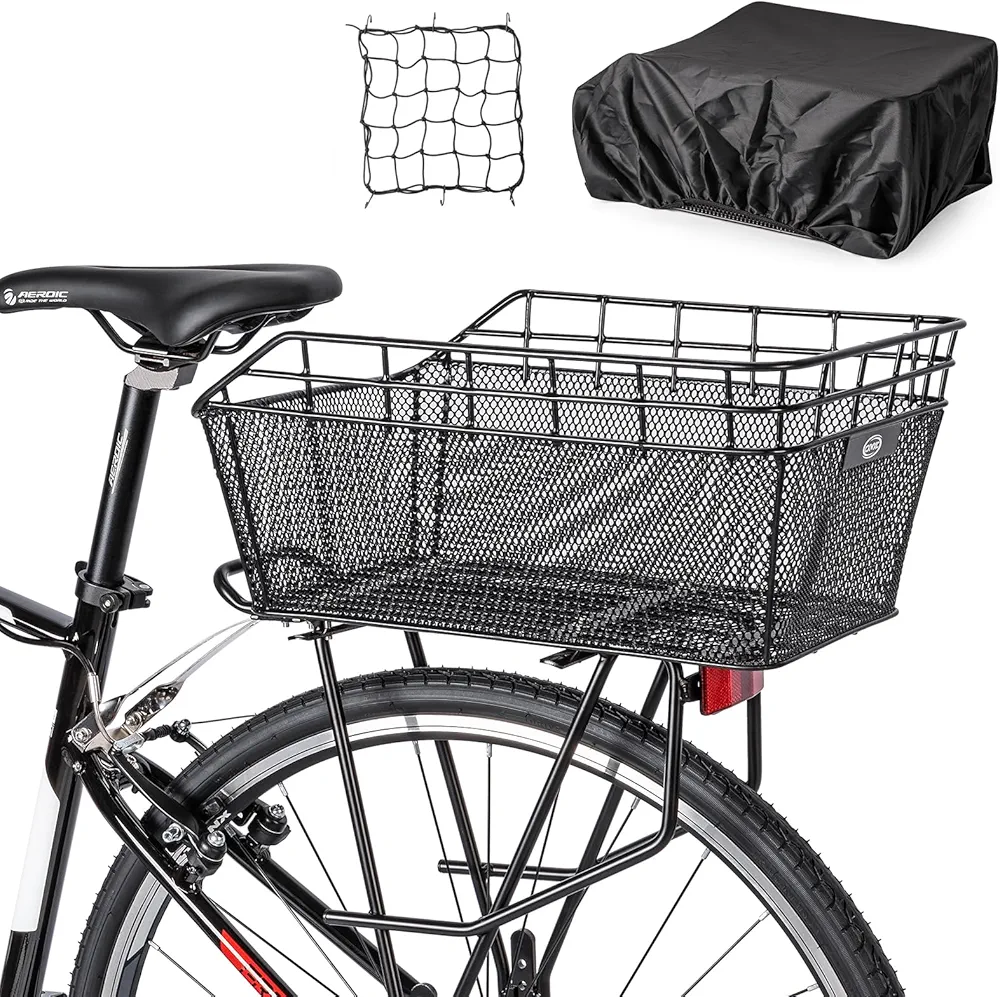 Rear Bike Basket – Large Bicycle Rear Basket with Cargo Net and Waterproof Cover, Wire Bike Baskets Rear Large Capacity (NO Bike Rack Include)
