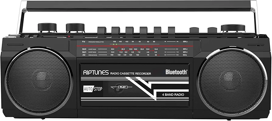Riptunes Cassette Boombox, Retro Blueooth Boombox, Cassette Player and Recorder, AM/FM/SW-1-SW2 Radio-4-Band Radio, USB, SD, and Aux in, Black