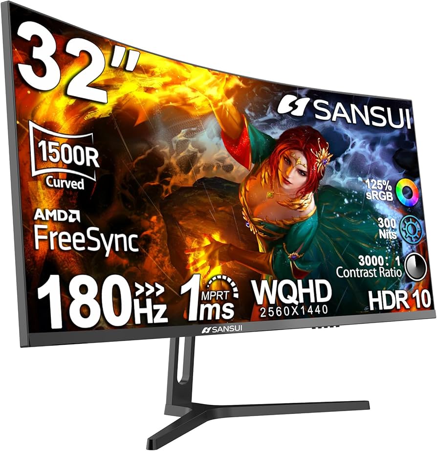 SANSUI 32-Inch Curved Gaming Monitor WQHD 2560 x 1440 180Hz Curved 1500R -1ms(OD), HDR, 300nits, sRGB 125%, DCI-P3 95%, FreeSync, HDMI x2, DP1.2×2(ES-G32C3 DP Cable Included)