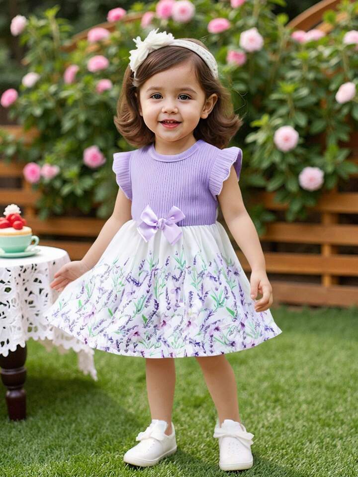 SHEIN Vintaside Kids فستان قطعة واحدة للبنت الصغيرة من الحرير بطبعة زهرية وأكمام قصيرة برقبة كشكش بنفسجي وأبيض مريح وعادي، مناسب لرحلات الصيف والخارج