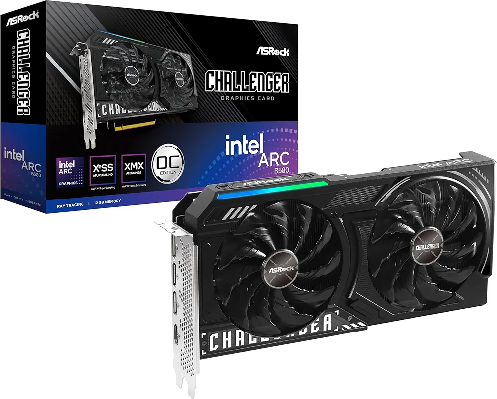 بطاقة رسومات من أس روك إنتل آرك بي580 تشالنجر 12 جيجابايت أو سي GDDR6 19 جيجابت في الثانية 192 بت 2740 ميجاهرتز 650 واط 7680 × 4320 بمراوح مزدوجة